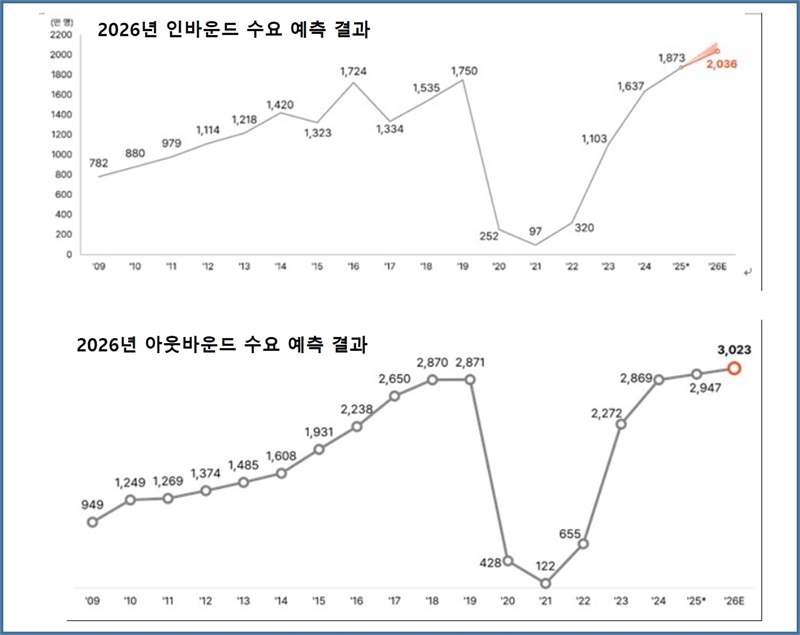 [한국레저신문 유인수기자] 2026년 새해에 한국을 찾는 외국인 관광객이 2천만명을 넘으면서 사상 최대를 기록할 것이라는 전망이 나왔다. 반면에 해외여행을 떠나는 국민 역시 내년 3천만명 수준으로 증가할 것으로 예측됐다.